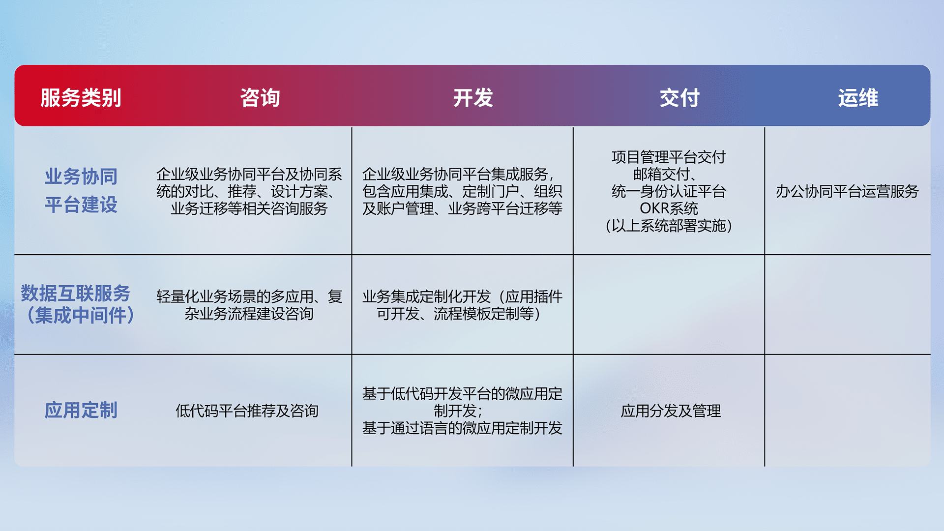 针对钉钉、、、、企微、、、IDaas等平台级产品提供产品的规划、、、、方案、、、交付、、定制化开发等服务,,,,实现如统一协同办公、、智能客户服务、、混合会议管理、、、、智能数据查询、、等业务场景,,,,实现数字化转型。。